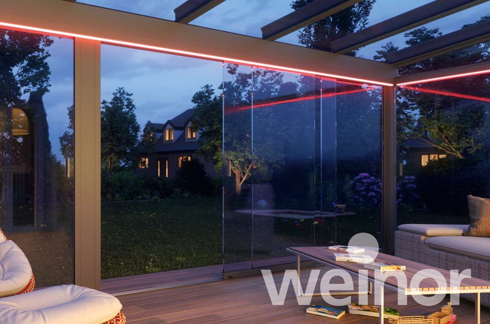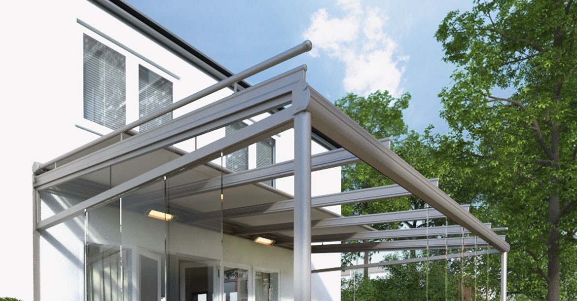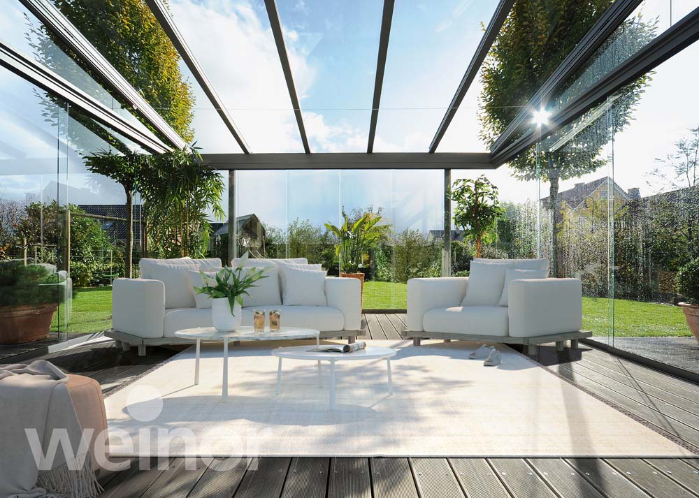 Besonders sind die rahmenlosen Seitenelemente aus Glas. Diese ermöglichen Ihnen einen ungehinderten Blick, der von keinem Profil verstellt wird. So genießen Sie Ihre Terrasse von den ersten Frühlingstagen bis weit in den Herbst hinein.